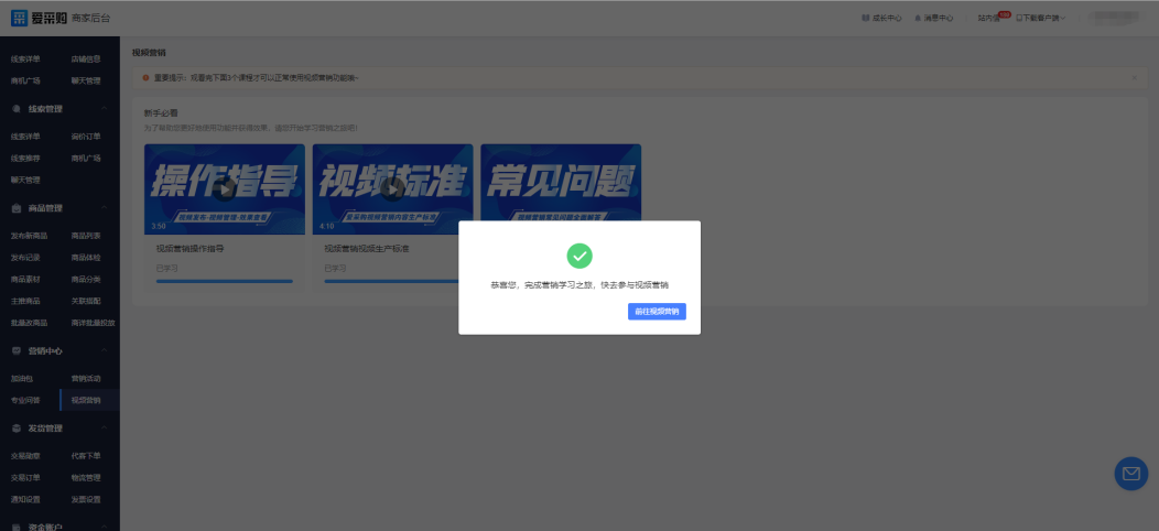2、愛采購(gòu)?fù)茝V新手必看的視頻,觀看完三個(gè)課程,為了幫助您更好地使用功能并獲得效果,請(qǐng)您開始學(xué)習(xí)營(yíng)銷之旅吧!